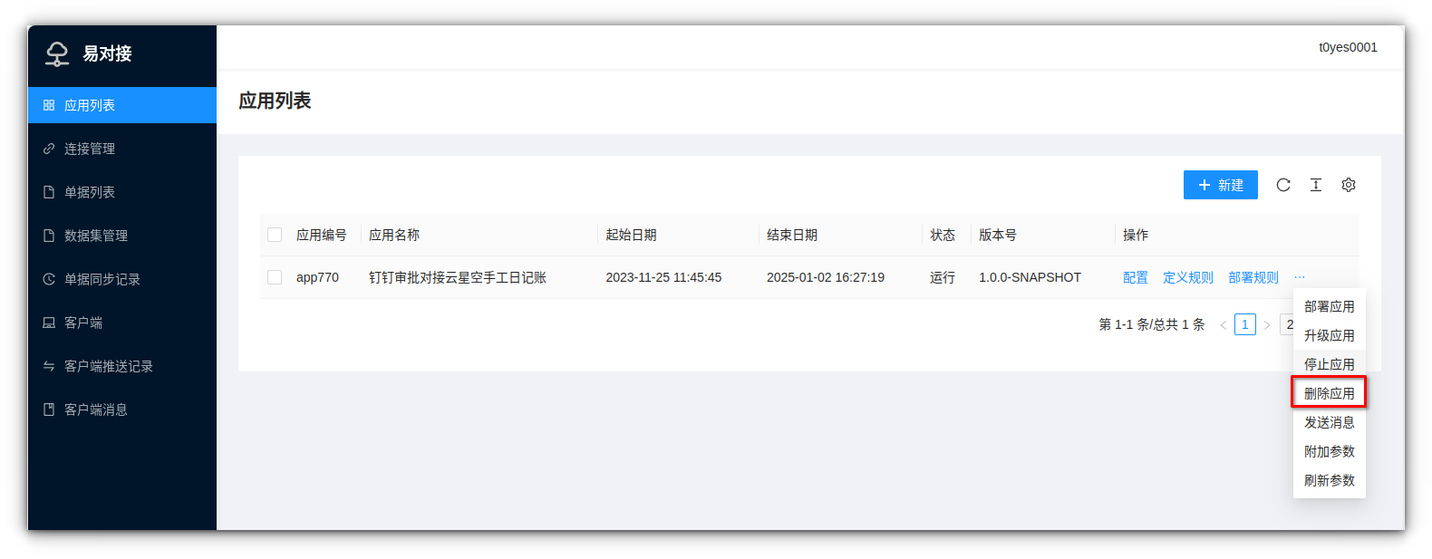 易对接使用说明应用管理本页总览应用管理 开通对接应用 点击应用列表 点击"新建" 选择应用类型 点击确定 设置对接参数 点击对接应用操作栏的”配置“功能 设置参数值(应用参数设置请参考易对接官方文档) 点击确认 安装应用到客户端 点击应用操作栏更多按钮,点击部署应用,可以将对接应用安装到易对接客户端。 升级对接应用 点击升级应用,将应用升级到当前最新版本 停止应用